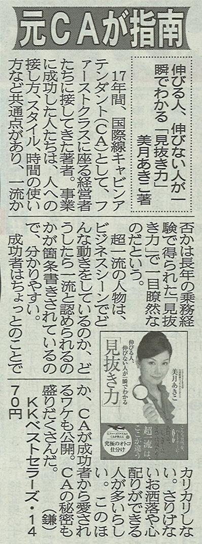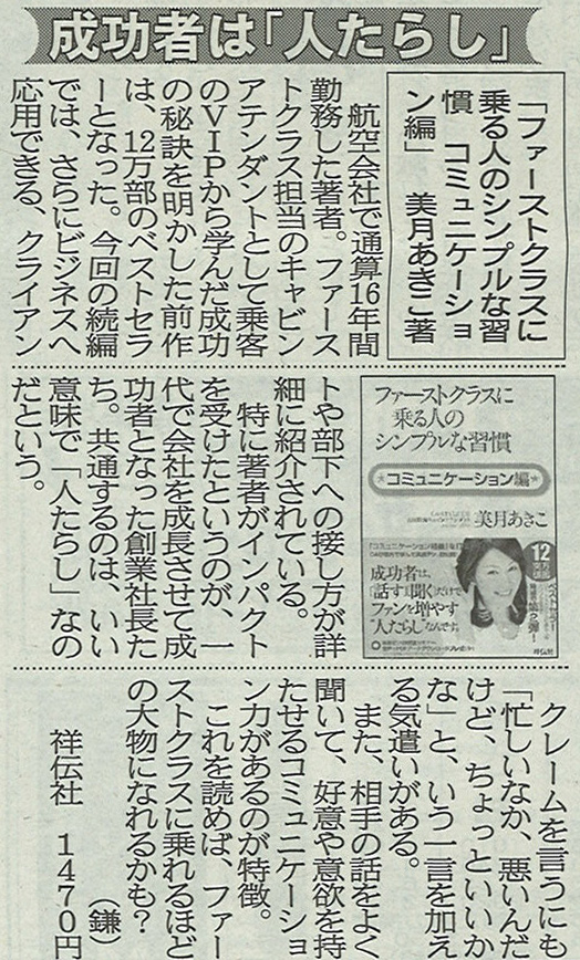日経新聞夕刊 4月8日 「ベストセラーの裏側」著書「ファーストクラスに乗る人のシンプルな習慣」のヒットの裏側が出ています。 |
