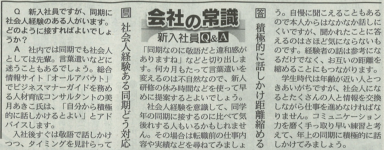 日本経済新聞 2011・5月9日朝刊「会社の常識 新入社員Q&A」 |